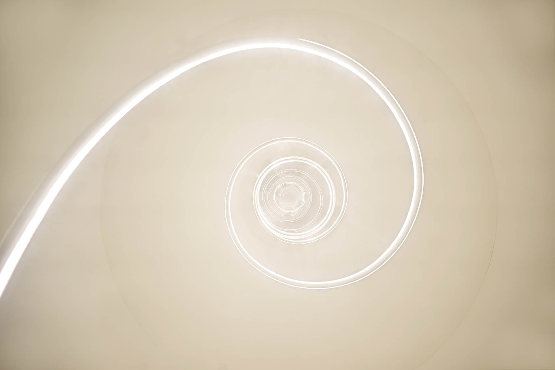 Moreover, Karolina Halatek’s installation explores eternity and perception through the interplay of light, mist, and sound. Composed as a luminous spiral with mirrored surfaces at its top and base, the work envelops visitors in an atmosphere where space seems infinite and the boundaries between body and light dissolve.