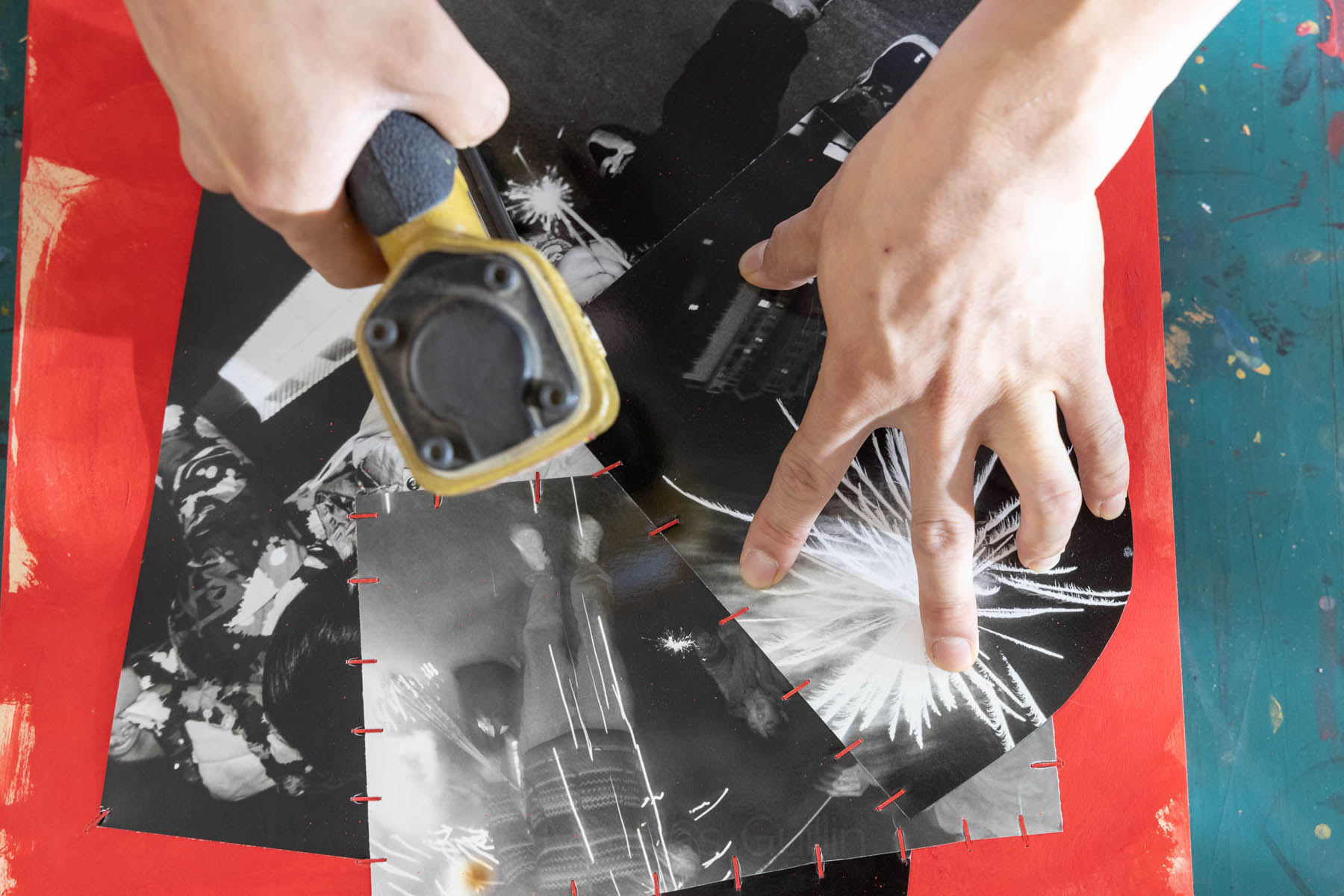 Entitled “Birdhead New Year Memories”, this artwork is composed of black and white photographs that the artists developed themselves in their Shanghai studio’s darkroom. Through this analog process, they cultivate a sense of intimacy and material presence that goes beyond the image. Using staples, the artists assembled the photographs into a collage set against a hand-painted red background. On the top, they inscribed the handwritten Chinese character “Fu,” symbolizing good fortune. The gesture unites personal craftsmanship with cultural symbolism.