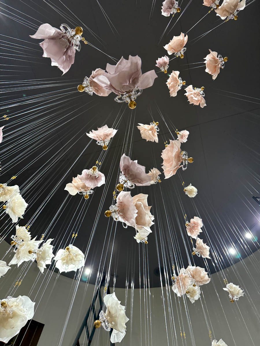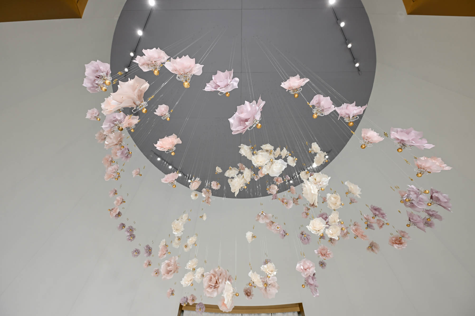With “Birth of an Icon,” Curran creates a celestial environment of kinetic textile roses. Each flower opens and closes in a steady rhythm, like a perpetual blossom. Suspended in space, the artwork moves in synchronized harmony. Metallic and textile petals expand and contract in cycles that evoke growth, fragility, and renewal.