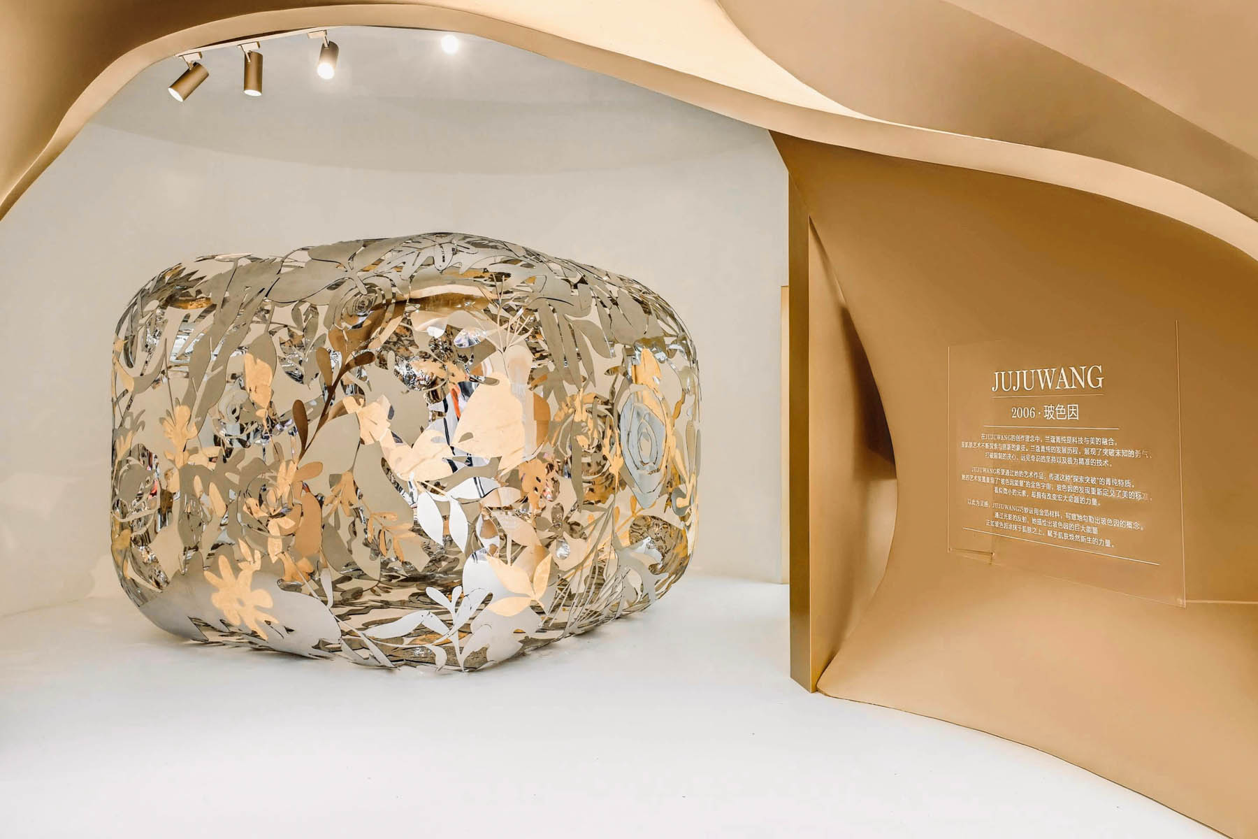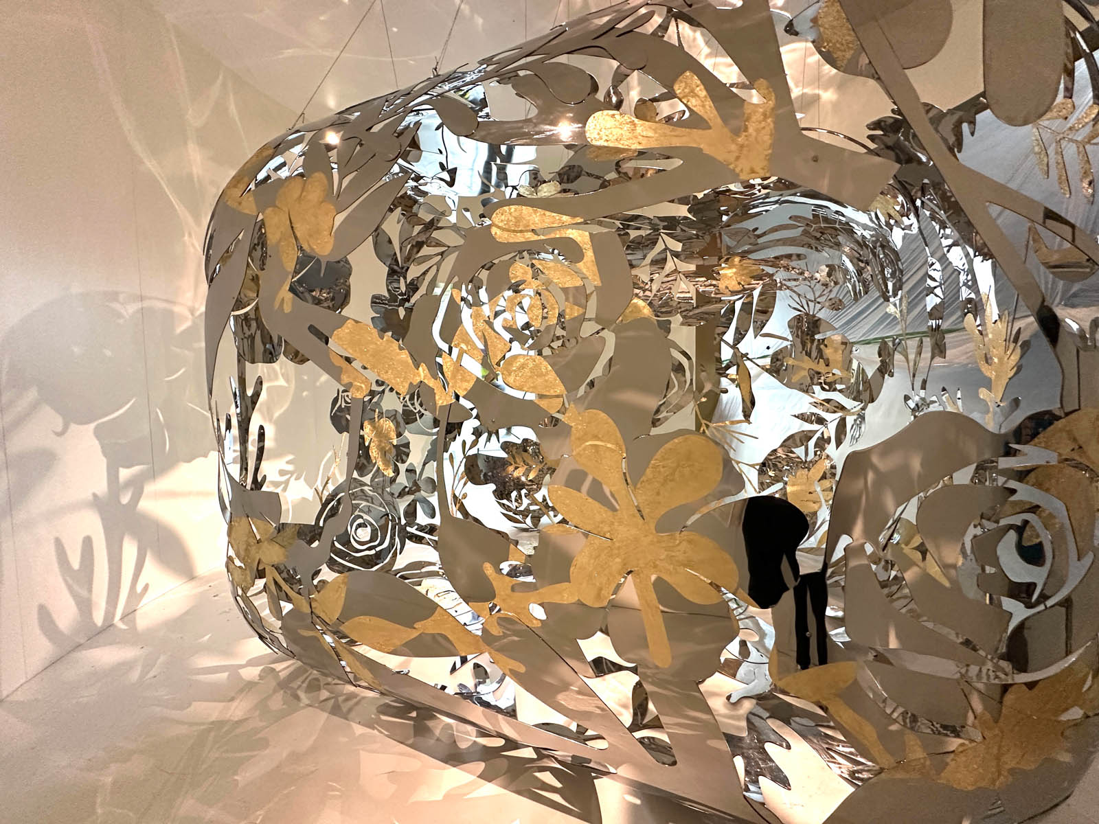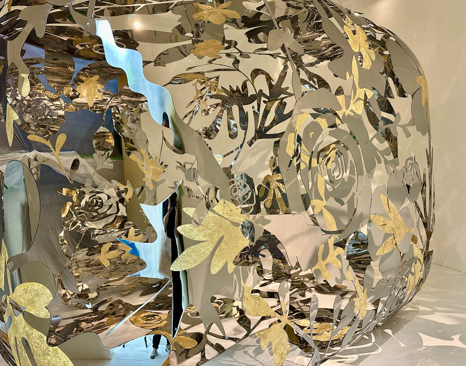 Entitled Garden of Everything, the installation by Juju Wang takes the form of a majestic openwork sphere. Its is crafted from stainless steel and gold leaf. Its surface, engraved with delicate vegetal motifs, captures and refracts light to project floral arabesques in motion—a living landscape that shifts with each change of perspective. Through this interplay of engraving, reflection, and illumination, the artwork embodies a perpetual cycle of transformation, where nature’s breath meets human ingenuity.