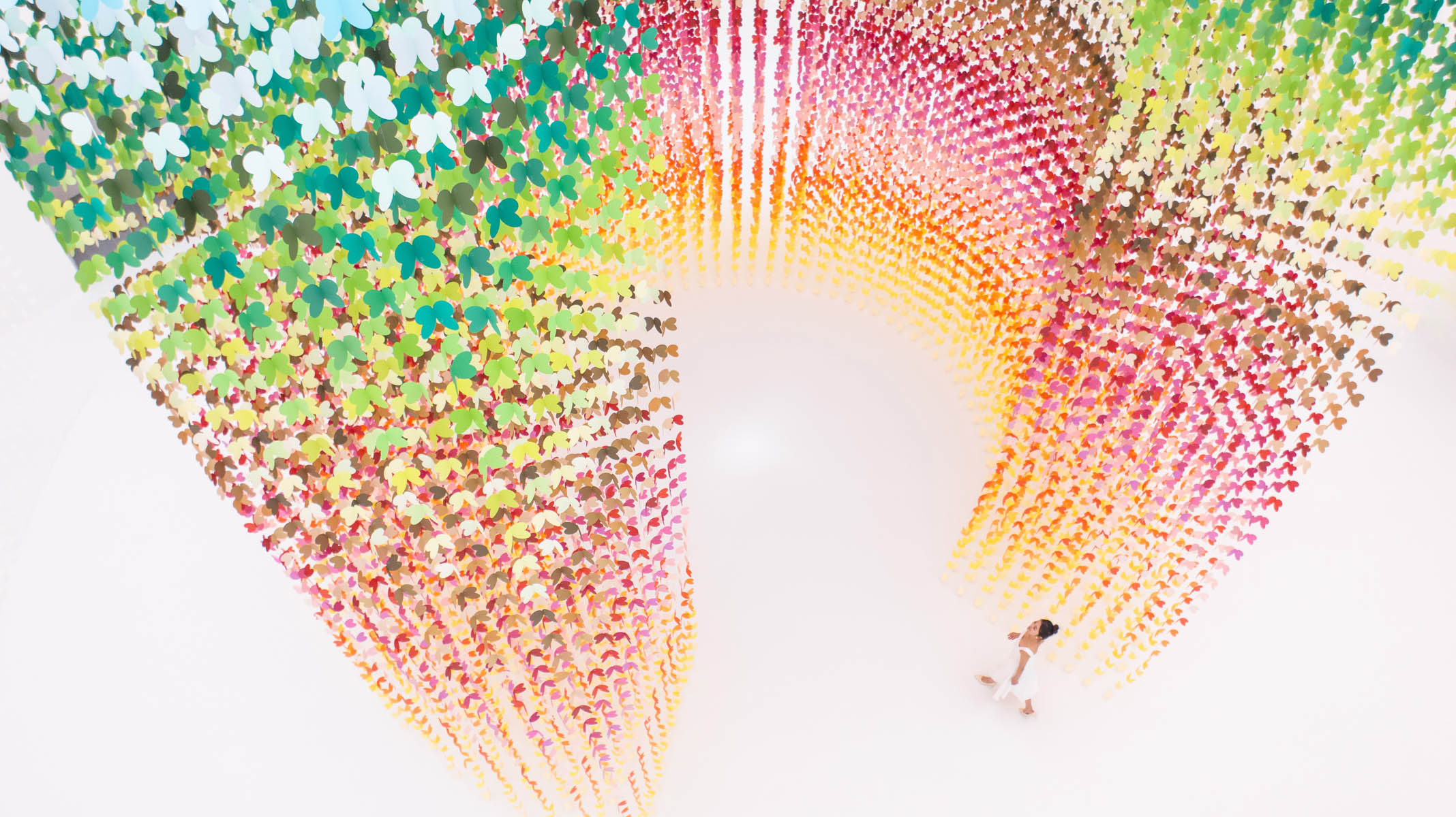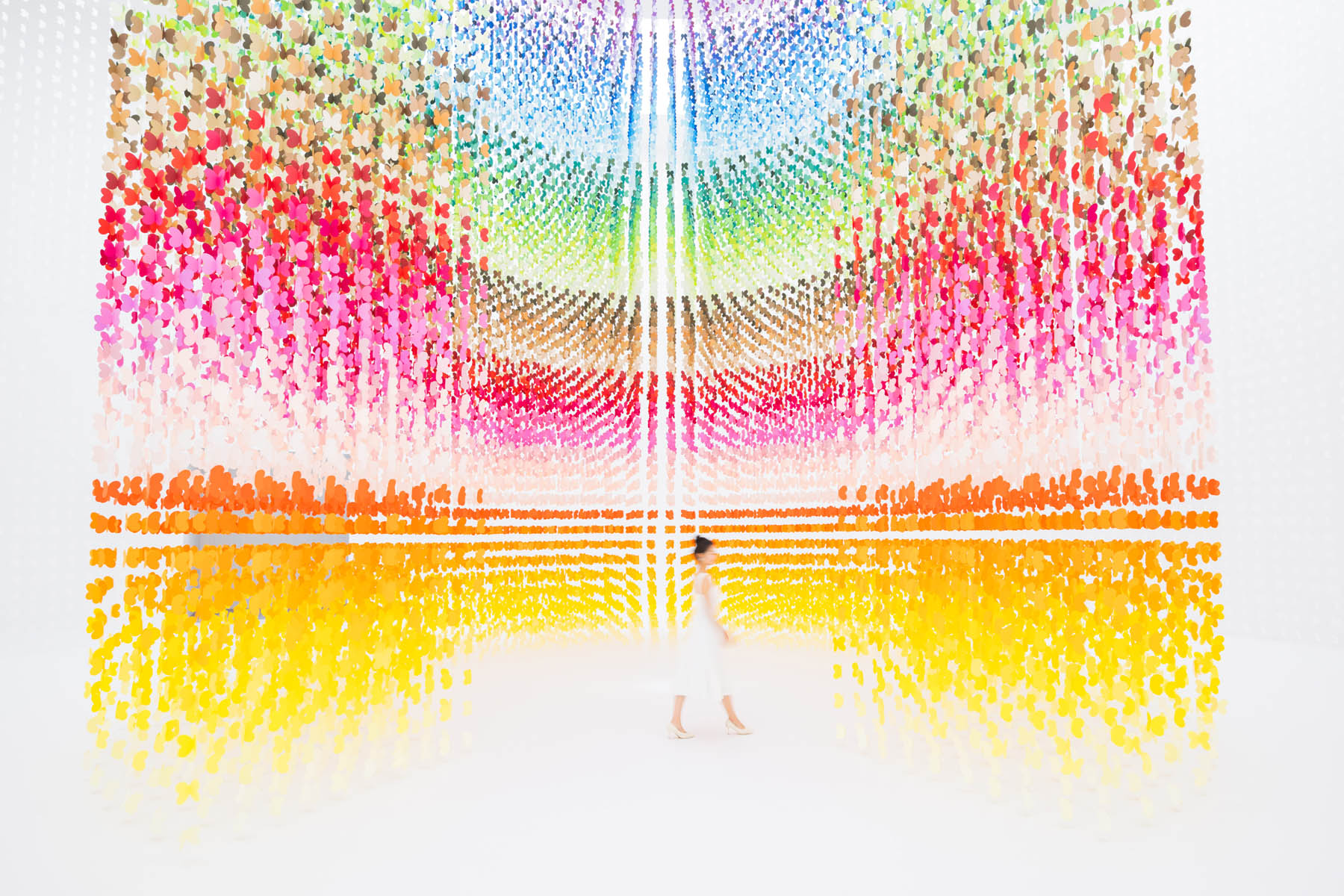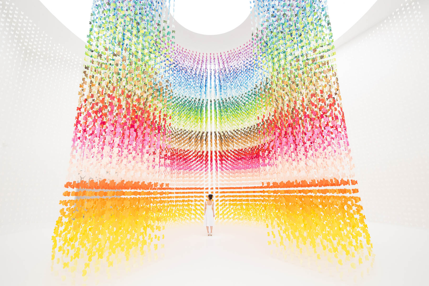 Entitled 100 Colors N°.48 “100 Colors Butterflies”, the artwork is a monumental paper-cut installation. It is composed of 40,000 butterflies in 100 meticulously selected hues, suspended to form a vibrant, layered composition. As part of her ongoing 100 Colors series, the piece transforms space into a floating chromatic landscape where color, light, and air become the architecture itself.