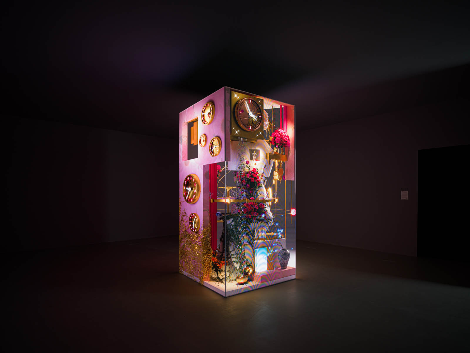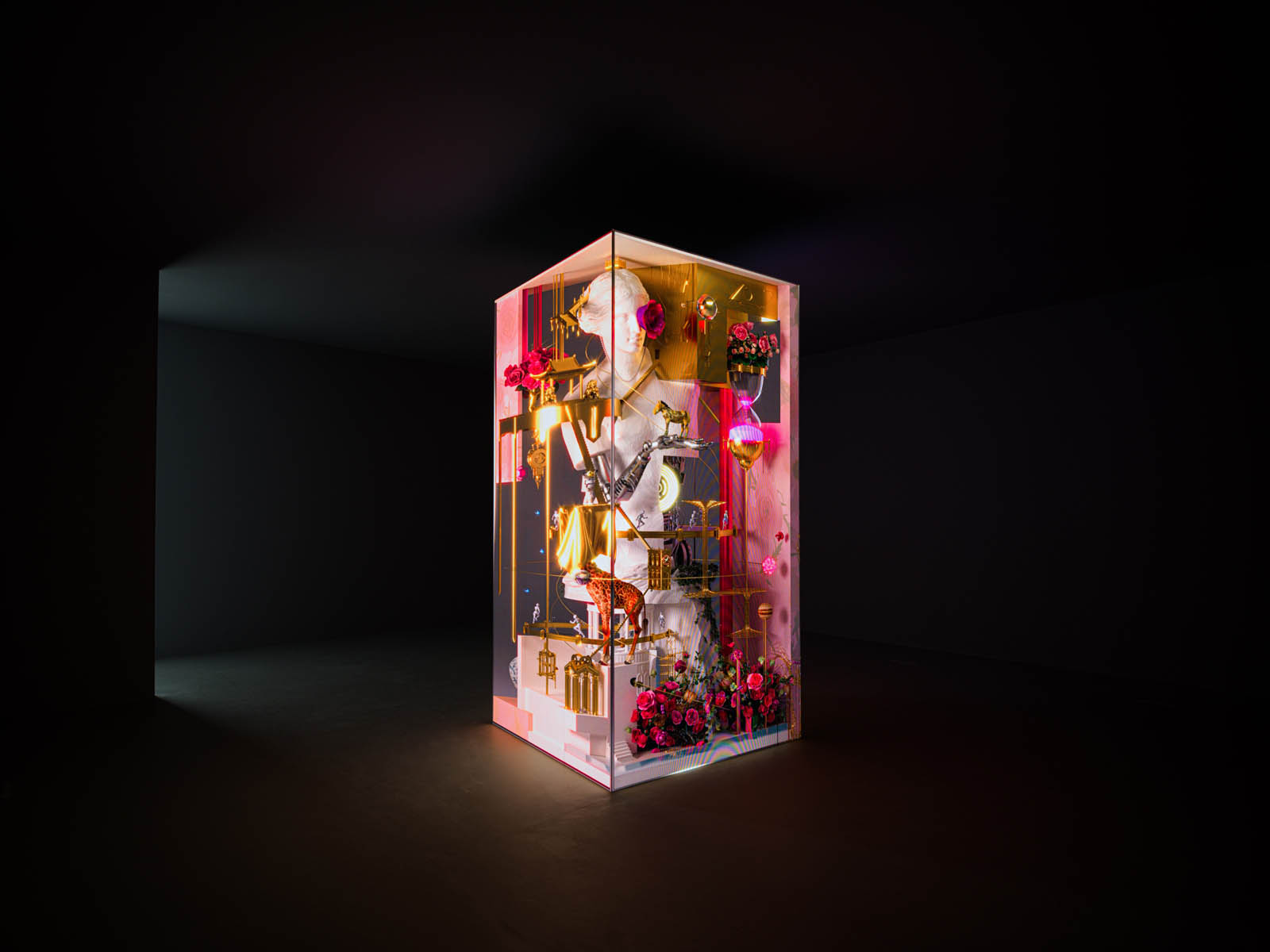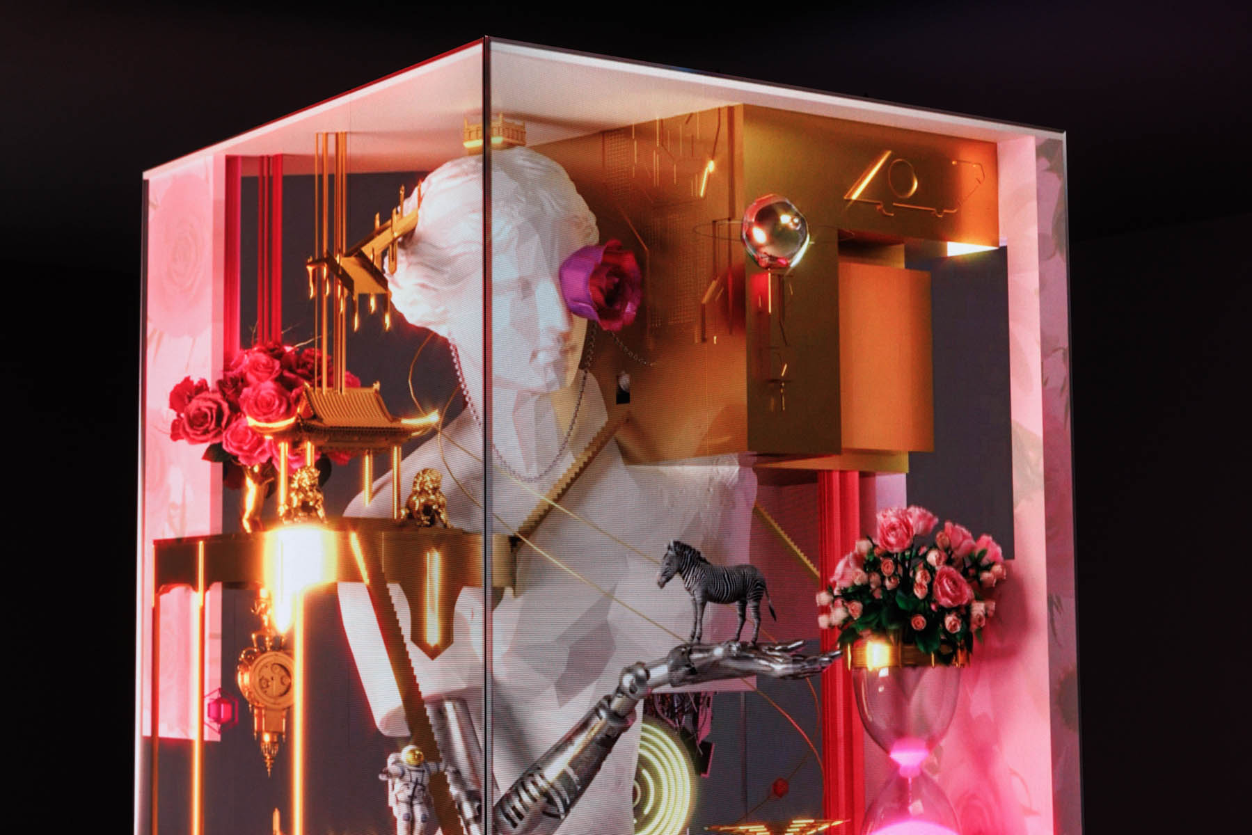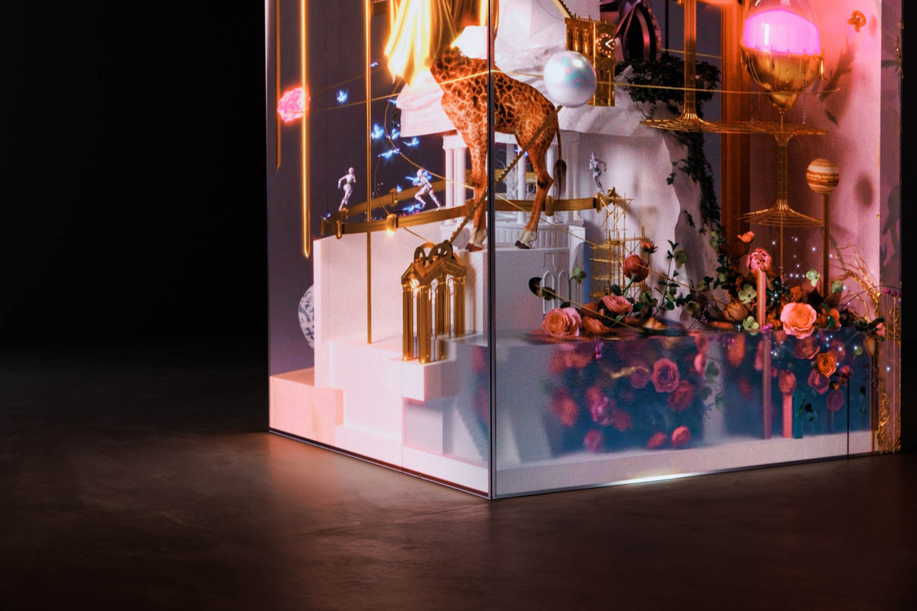 Around the sculpture, planets, wristwatches, roses and diamonds orbit in continuous motion — metaphors for perpetuity, rhythm, and transformation. These elements evoke the passing of seasons and the flow of time, while the video projection runs on an infinite loop, without beginning or end, reflecting the eternal pursuit of beauty that defines every era.