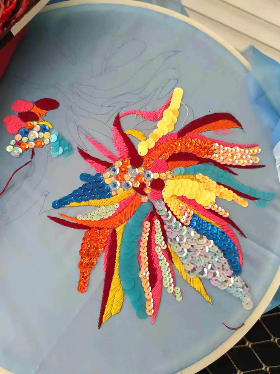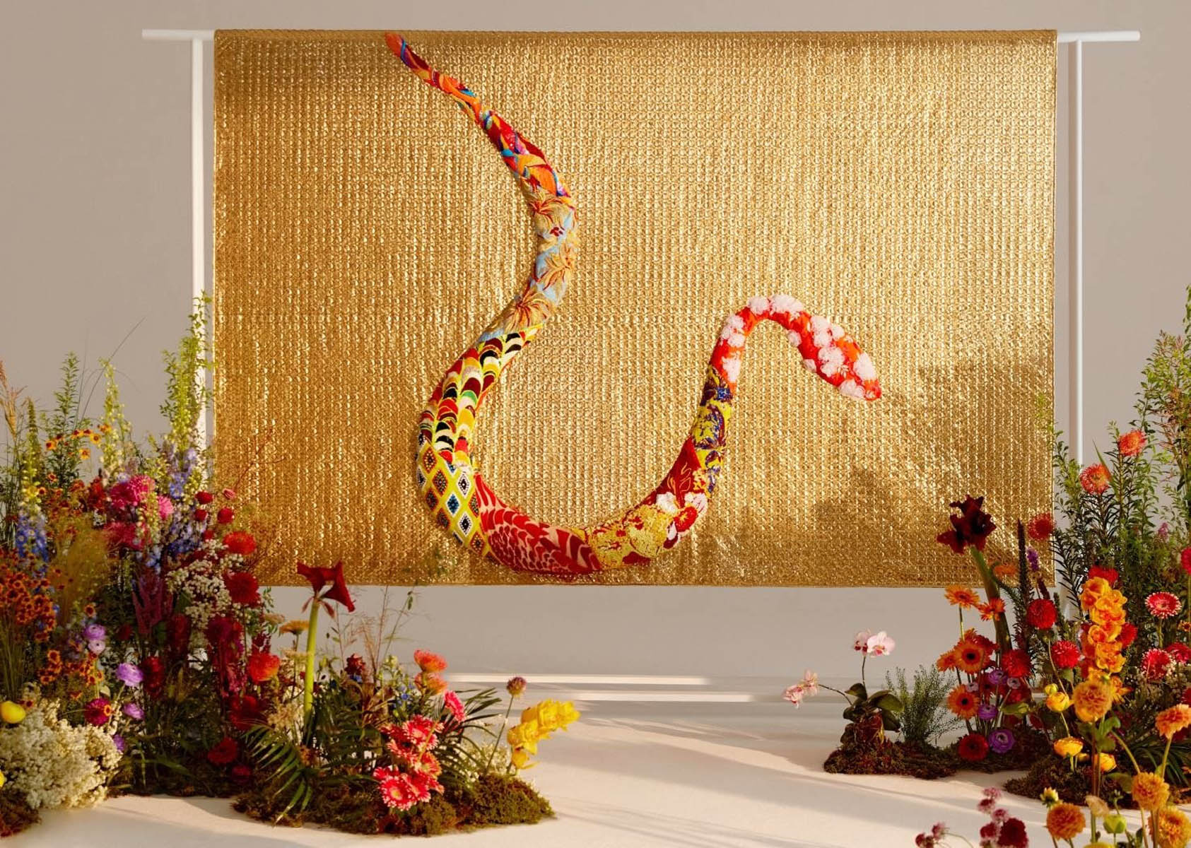 Entitled She Blossoms in the Sky, this large-scale double-sided tapestry combines hand-drawn motifs, jacquard weaving, Suzhou embroideries, and sequins. These layers shape a richly textured landscape of floral forms and abstract snake patterns.