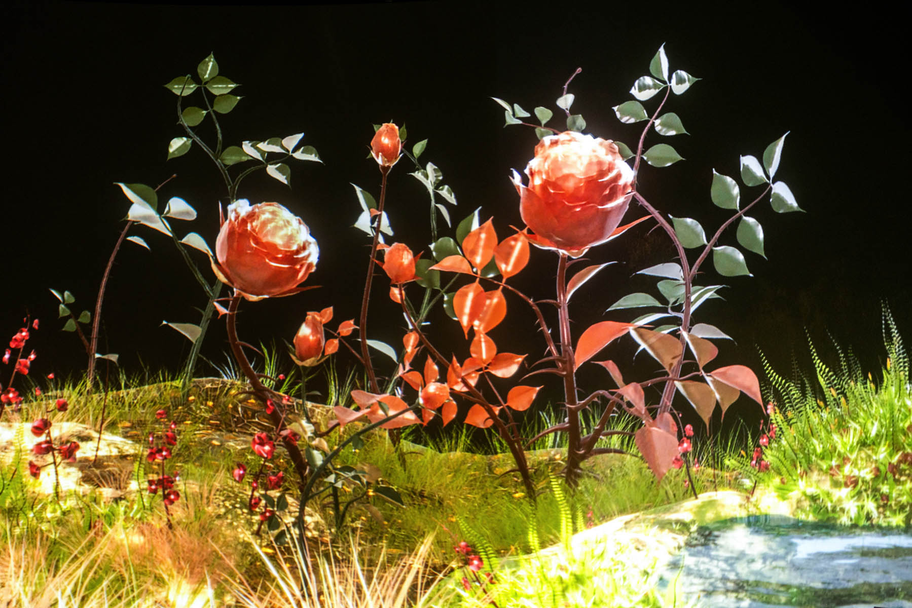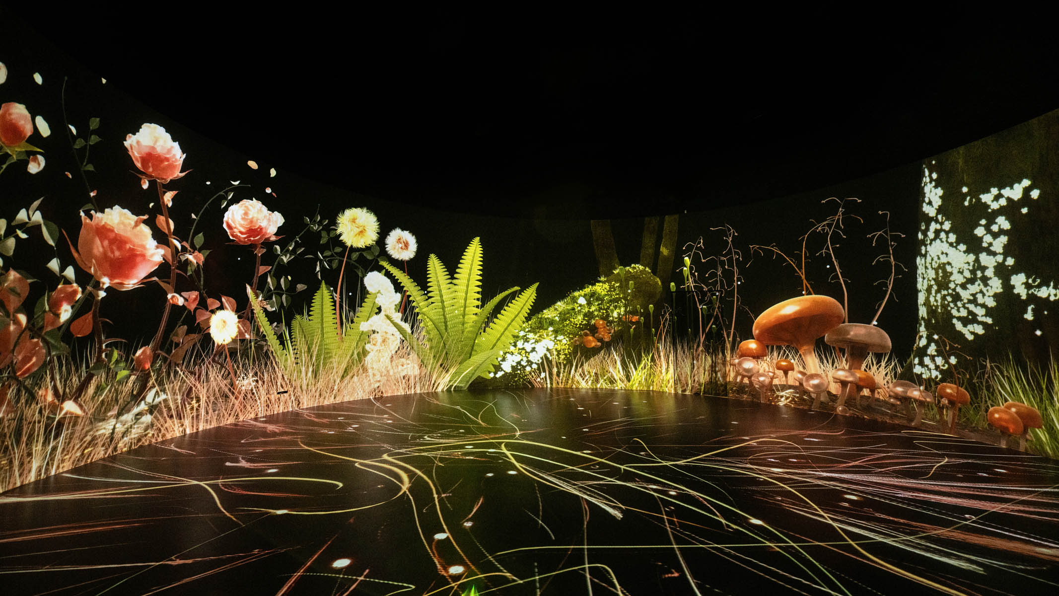 The installation by Danni Zheng is a 360° multisensory digital artwork that immerses visitors in a botanic garden of the future. Using panoramic projection animation, sound, and fragrance, the artist transforms the space into a living ecosystem where roses, lichens, mushrooms, moss, and bio-materials form a landscape of continuous growth and transformation.
