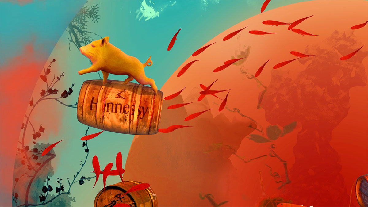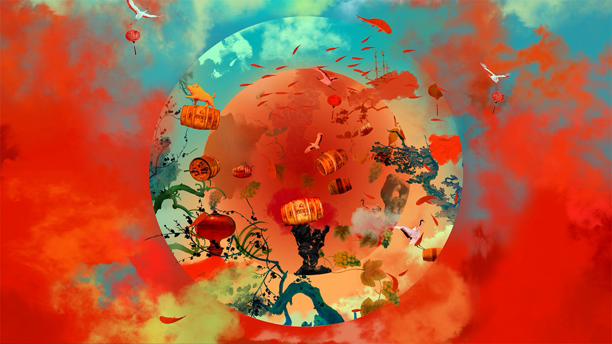 Inspired by the Year of the Pig, the artwork reflects the cyclical rhythm of life through a layered digital collage. Symbols of heaven and earth, past and present create a sense of balance and harmony. At its centre, interlocking circles evoke completion and fulfillment, while subtly echoing Hennessy’s signature double distillation. Through geometry, blur, layering, and contrast, Zhang builds a rich visual language that expresses cultural fusion and the precision of Hennessy’s craftsmanship.
